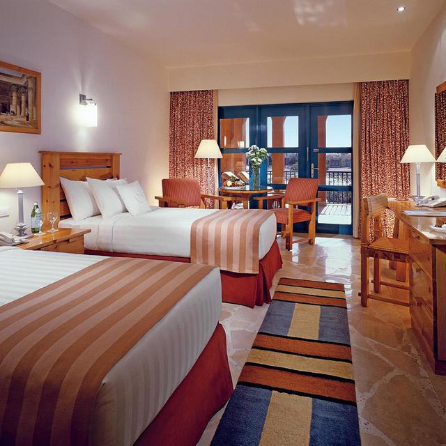 De ruime kamers liggen verspreid over het resort en bieden uitzicht op de lagunes, privéstrandjes of het zwembad. Ook bevinden de drie restaurants zich allemaal op een andere locatie. Maak een culinaire wereldreis door steeds een ander restaurant uit te proberen: in hoofdrestaurant Miramar geniet je van allerlei internationale gerechten, terwijl je de authentieke Midden-Oosterse keuken kunt proeven in het Oriental 1001 restaurant. En voor een romantisch diner met kaarslicht ben je in het Italiaanse restaurant La Piscina aan het juiste adres.